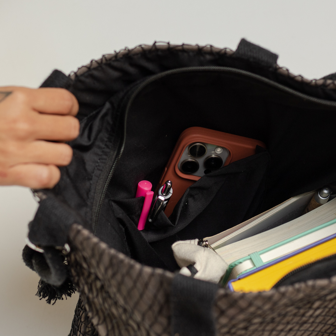 No lado de dentro, o forro feito com tecido de sombrinha (isso mesmo!) tem um bolso interno e zíper — tudo pensado pra durar e pra surpreender. Ah, e a alça é regulável: dá pra usar no ombro ou como tiracolo e tem uma segunda alça de mão.