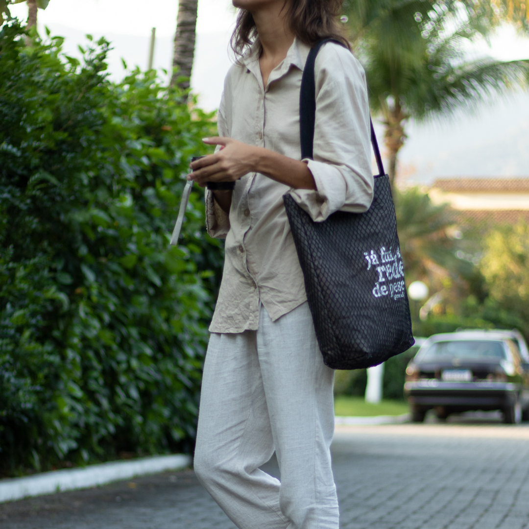 Ela combina a textura da rede de pesca reaproveitada com a resistência da lona de algodão nacional e sustentável.