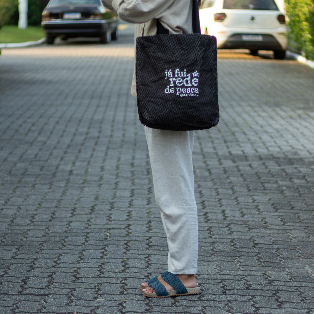 Ela combina a textura da rede de pesca reaproveitada com a resistência da lona de algodão nacional e sustentável.