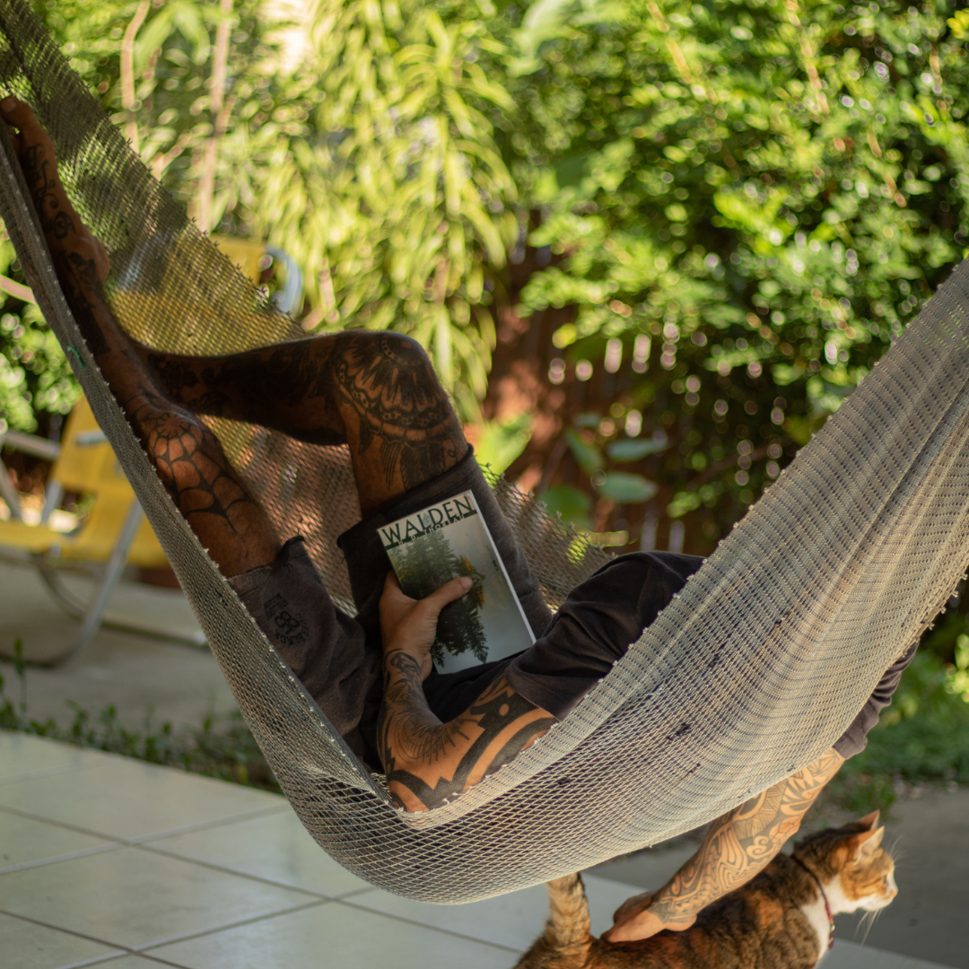 Sabe aquela rede clássica de descanso? Agora imagina ela feita com rede de pesca reutilizada, resgatada do mar e transformada por muitas mãos em um produto cheio de propósito (sem exagero, prometo!).