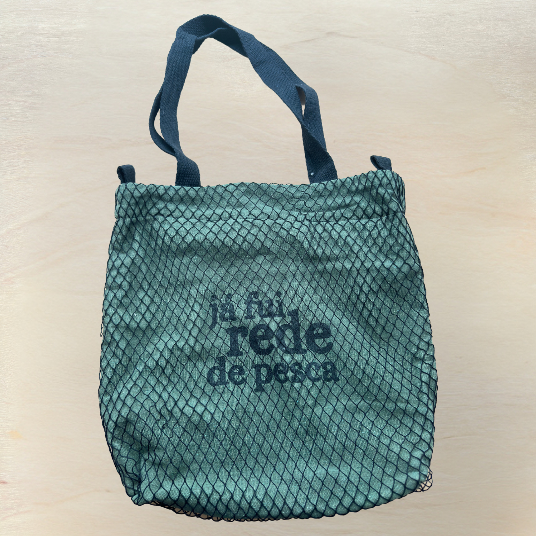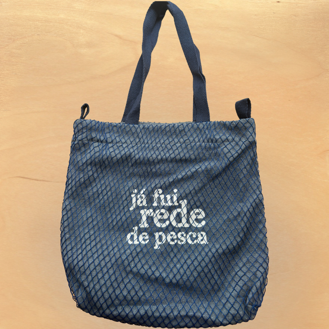 Ela combina a textura da rede de pesca reaproveitada com a resistência da lona de algodão nacional e sustentável.