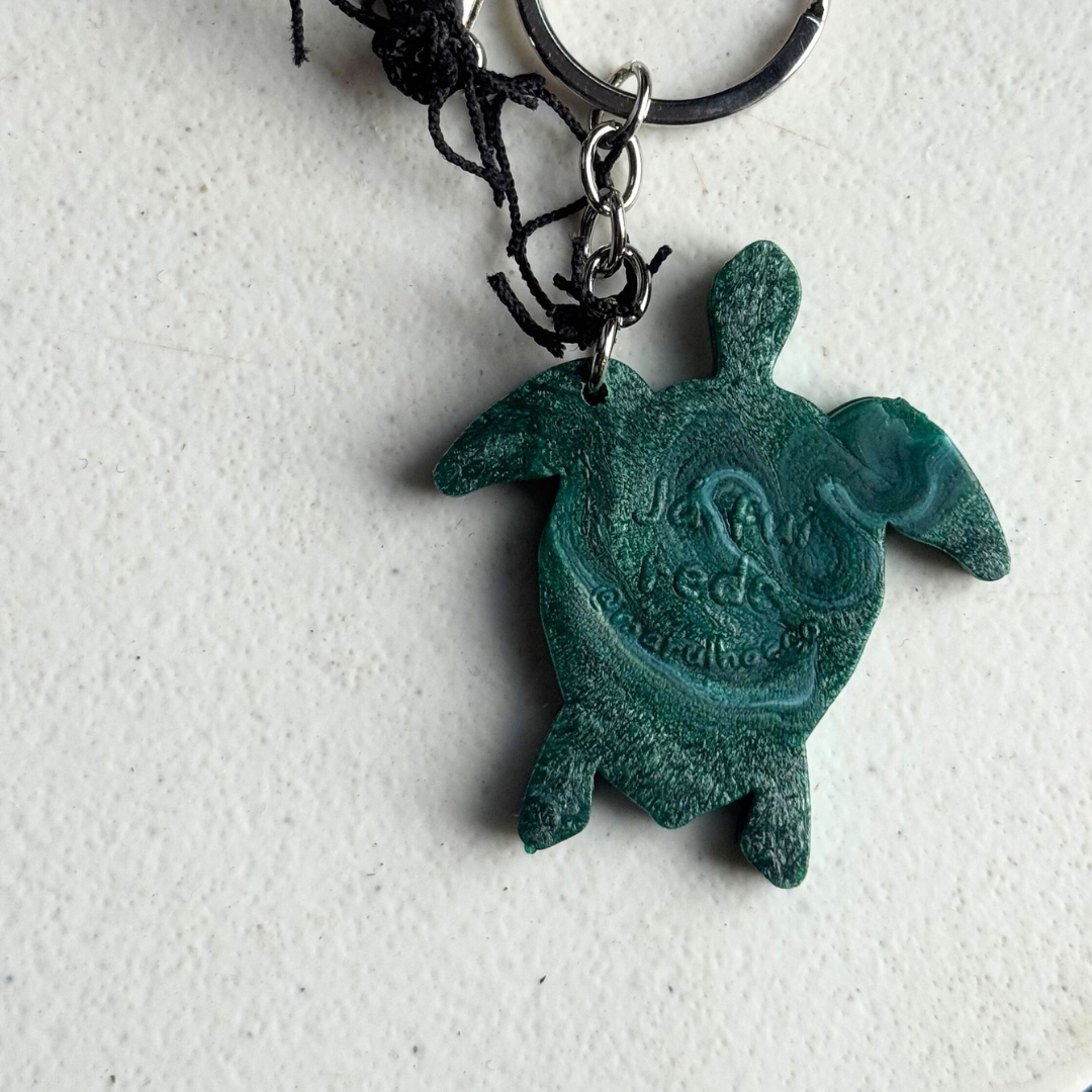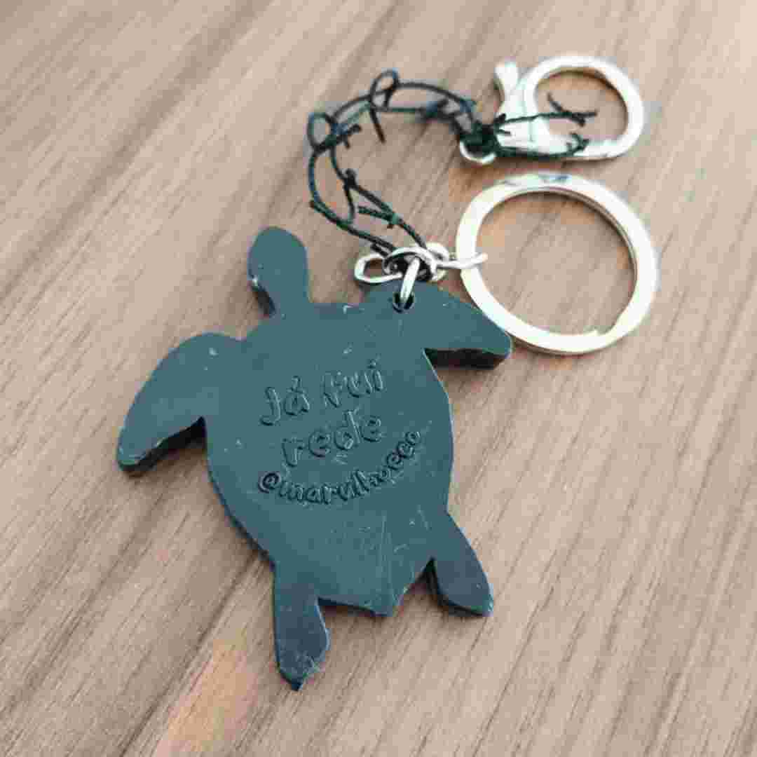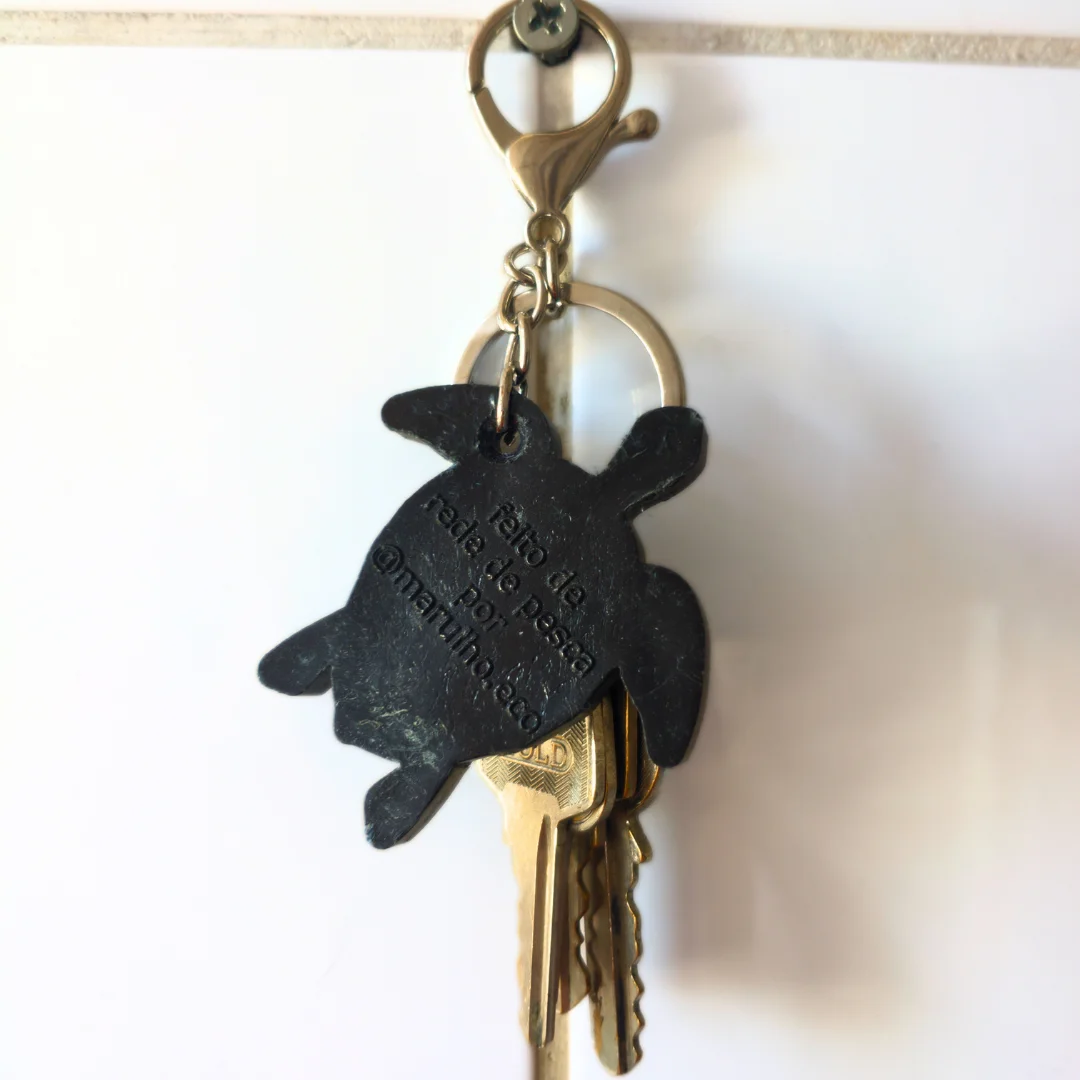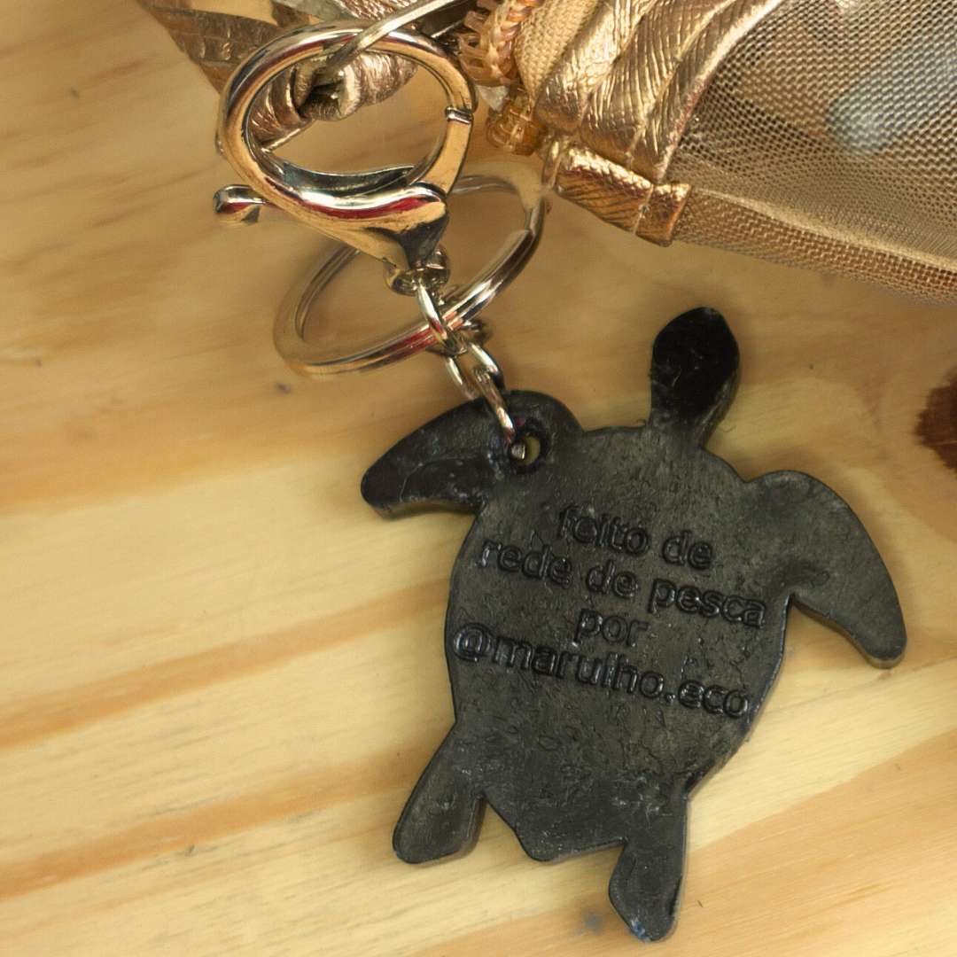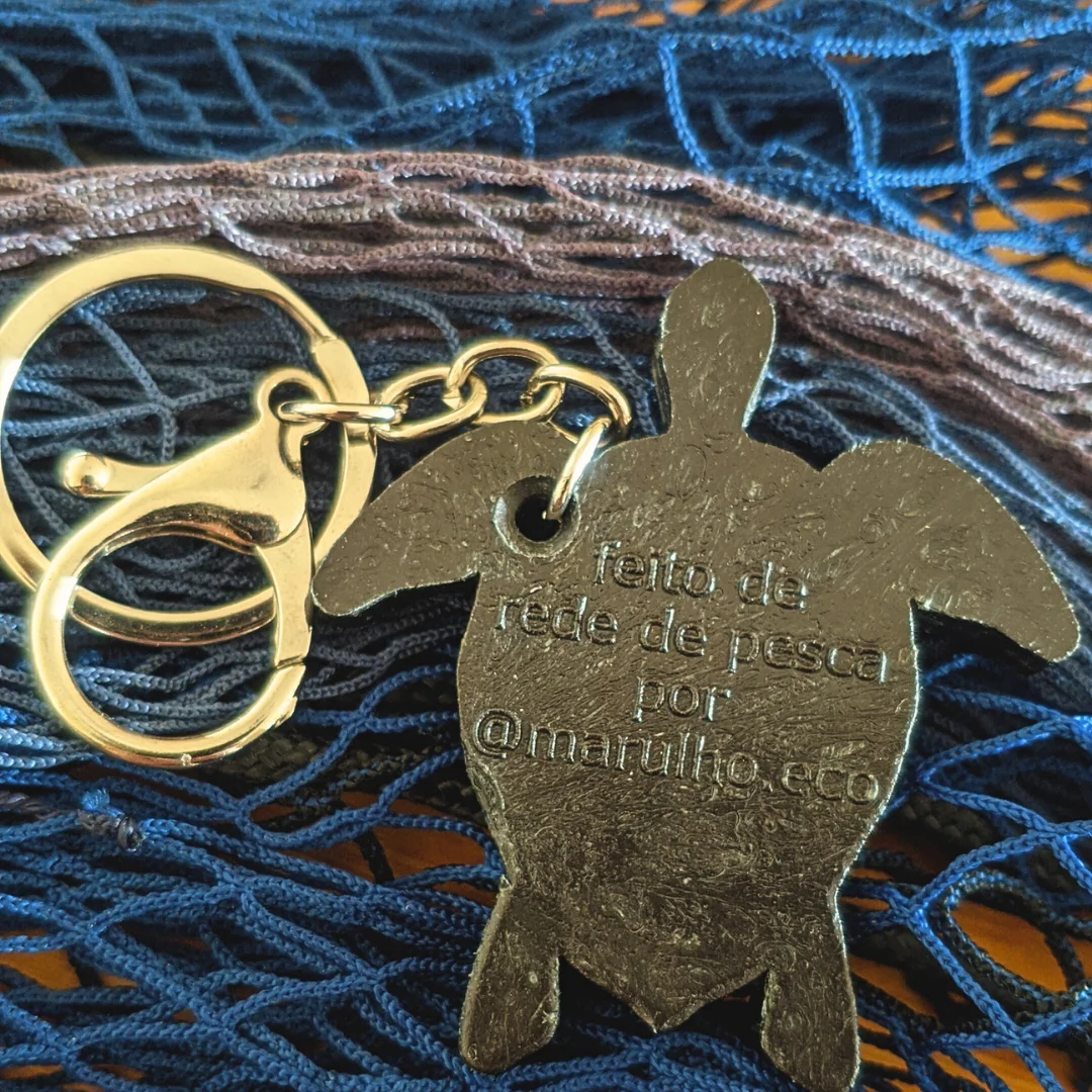 Chaveiro Marulho – Sustentável e feito de redes de pesca recicladas. Em formato de tartaruga, simboliza a preservação marinha e a circularidade.