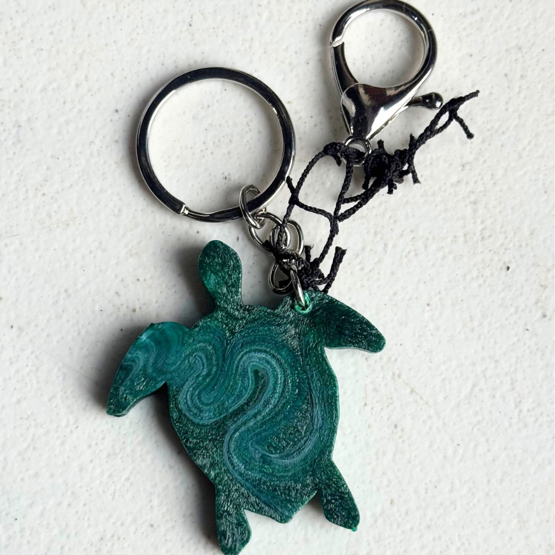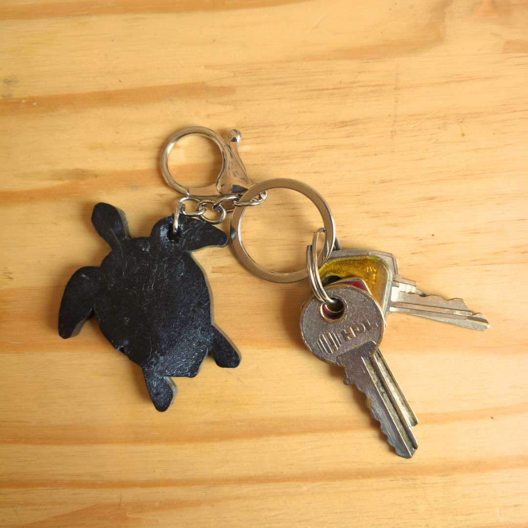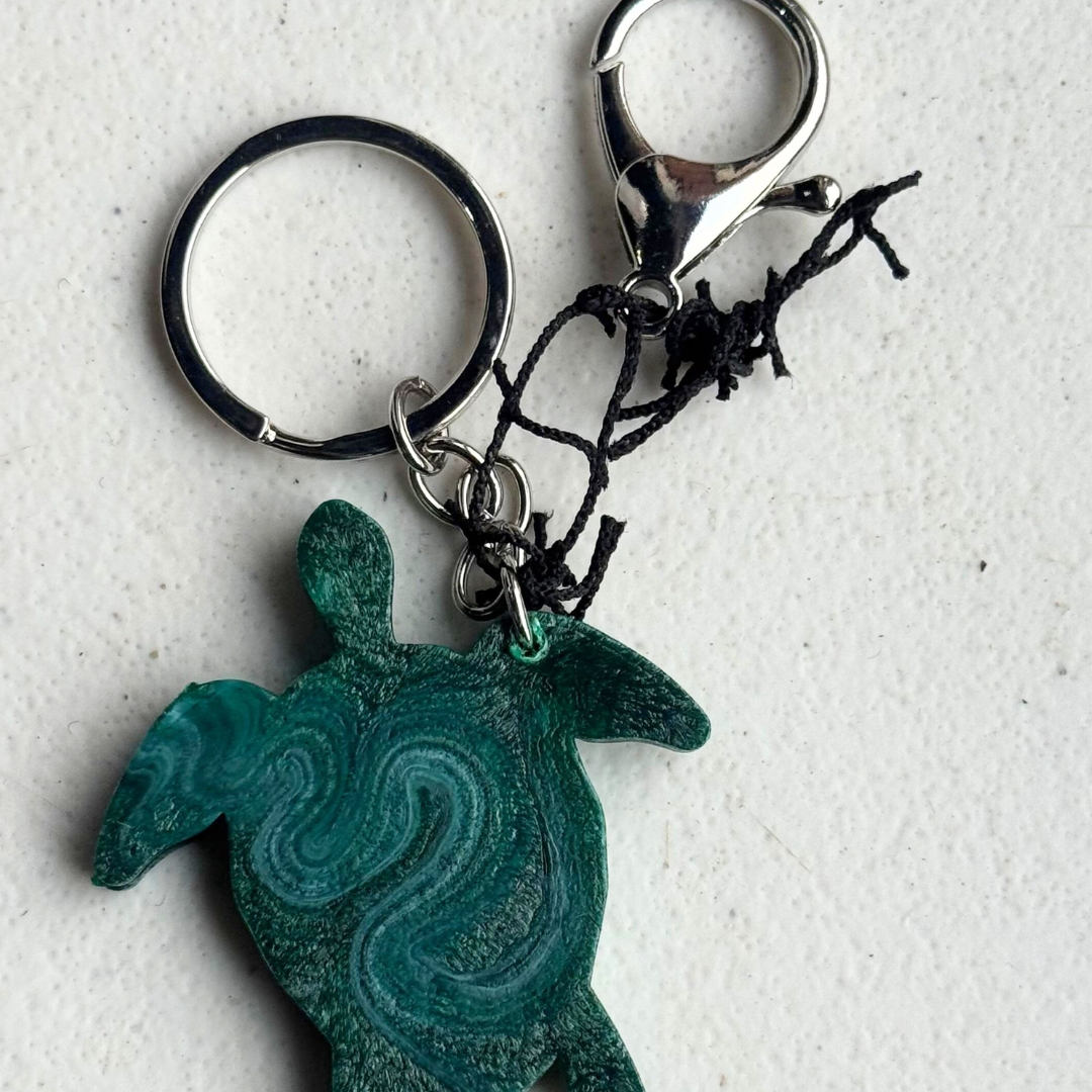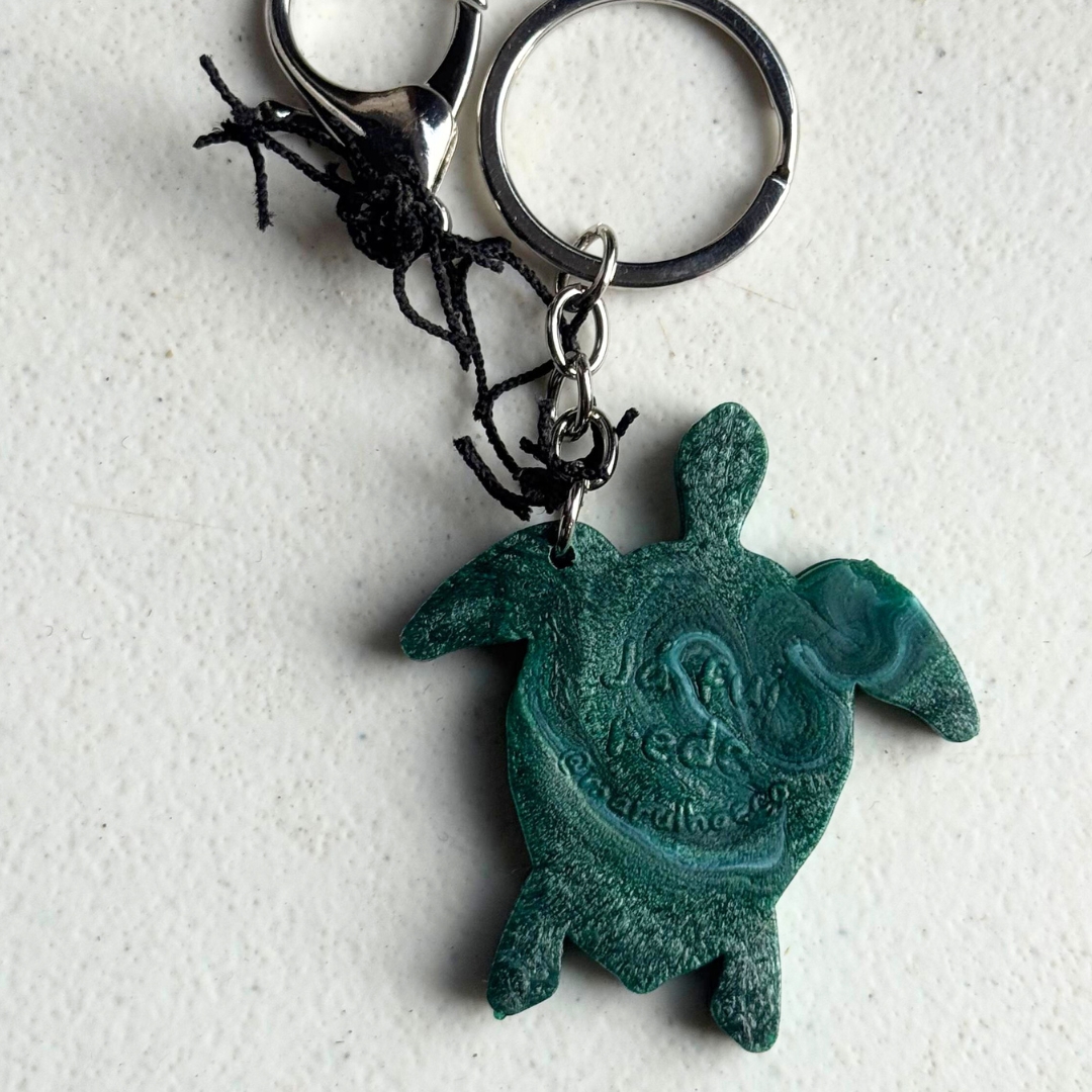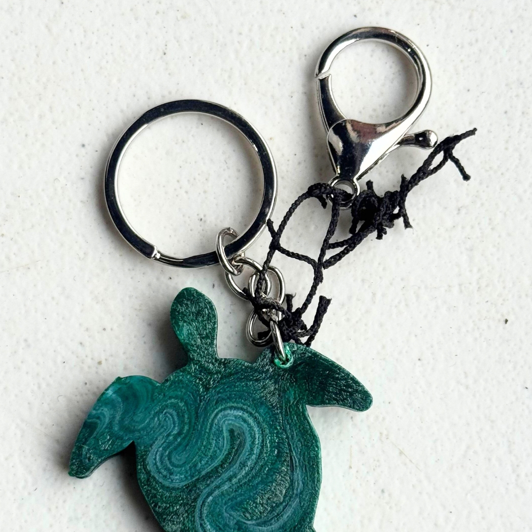 Chaveiro Marulho – Sustentável e feito de redes de pesca recicladas. Em formato de tartaruga, simboliza a preservação marinha e a circularidade.