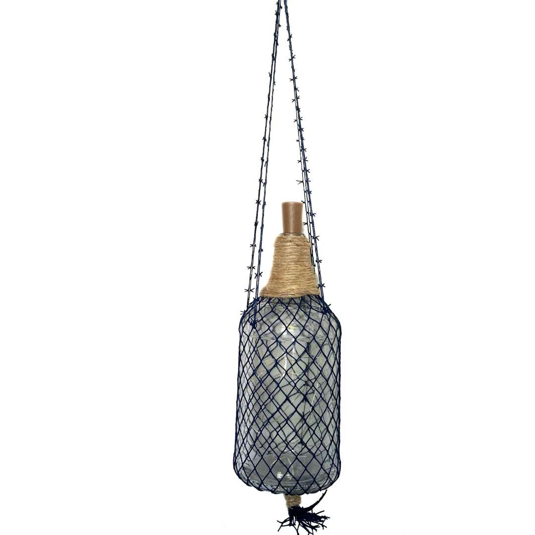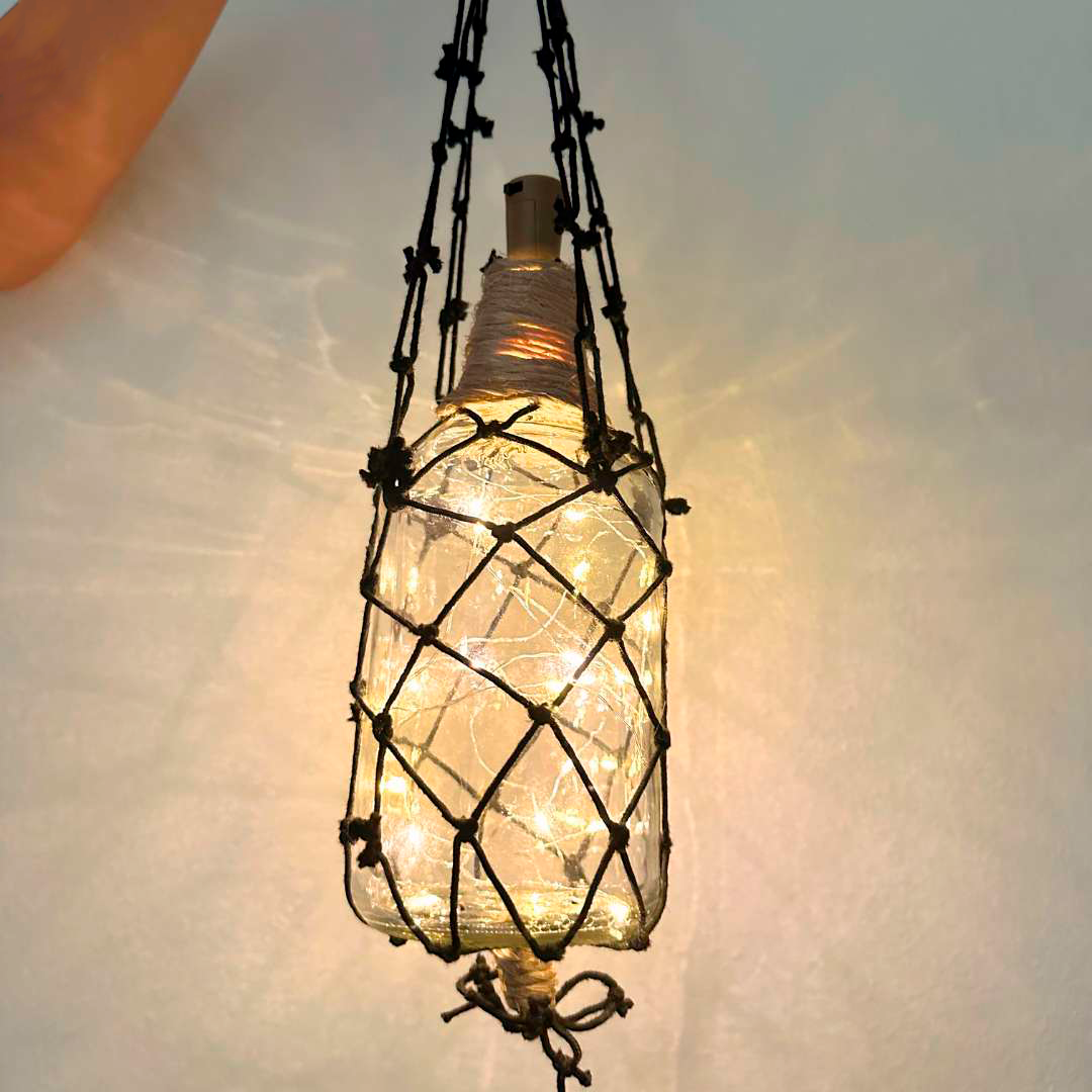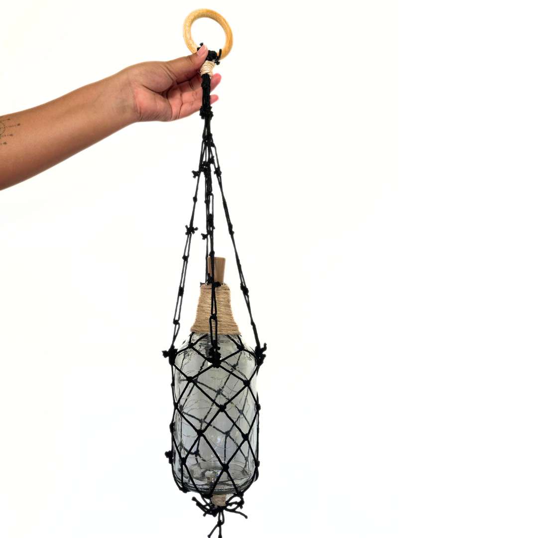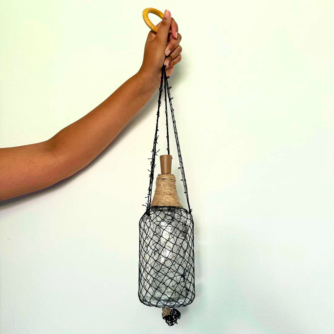 As garrafas ganham nova vida envoltas com redes de pesca interceptadas, que criam uma trama única ao redor da garrafa e sustentam com delicadeza a argola de madeira, tudo finalizado com amarração manual em sisal natural.