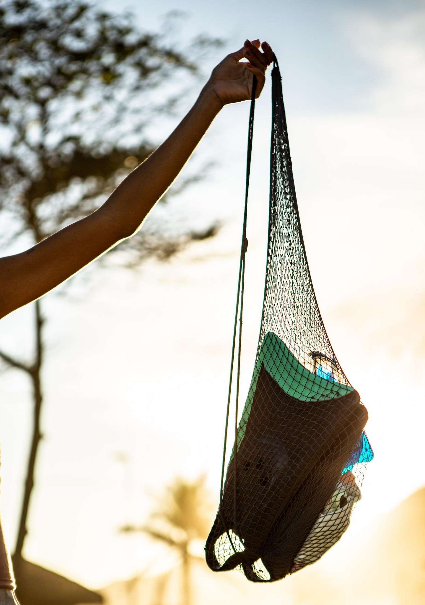 • Alças de corda feito de garrafas PET recicláveis e fecho superior